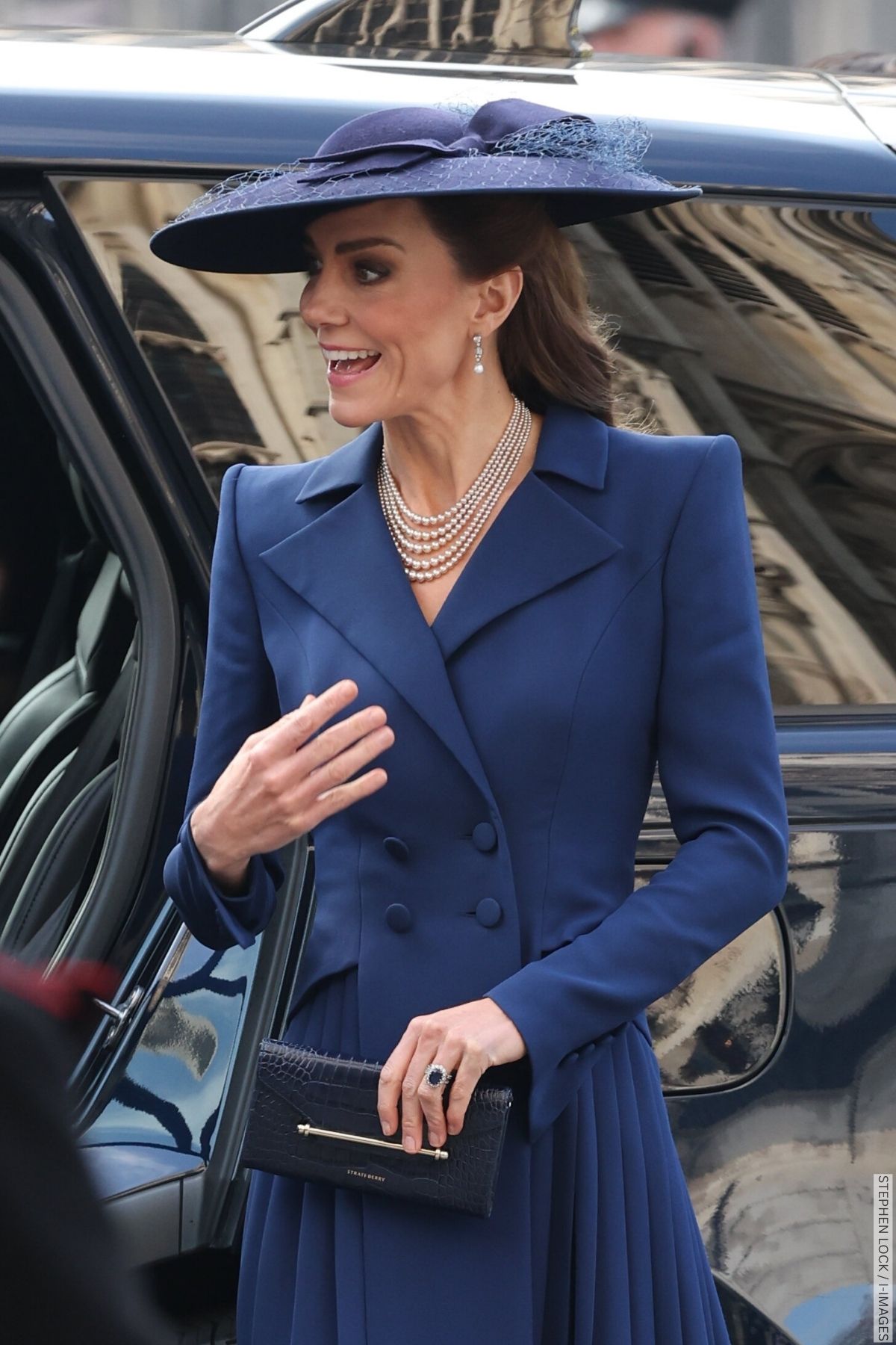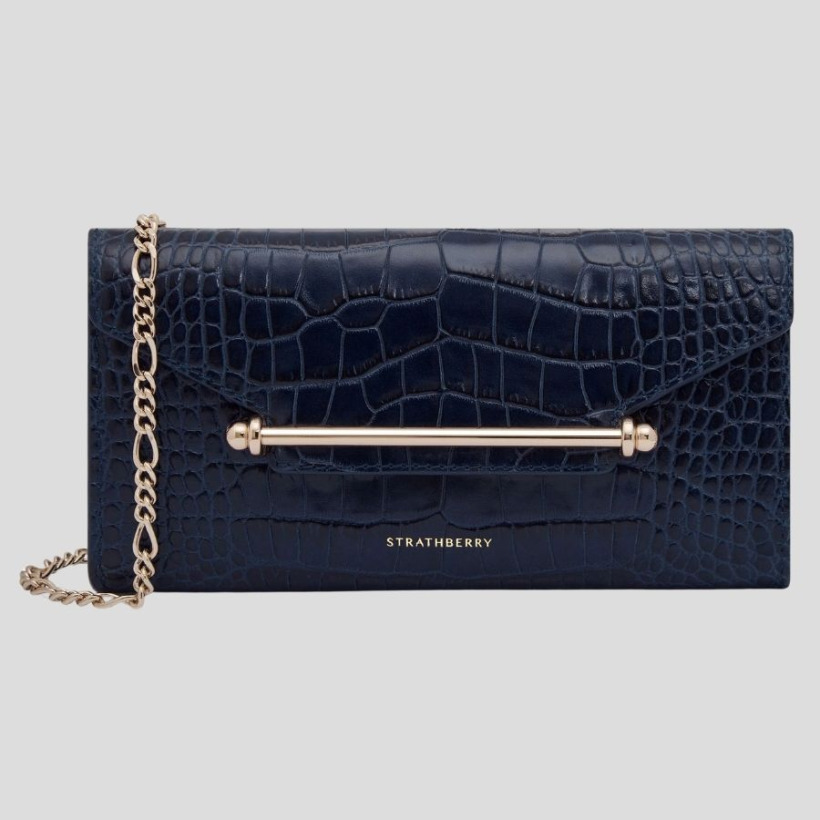 The Princess carried her navy croc-embossed ‘Multrees’ chain wallet by Strathberry at today’s service.