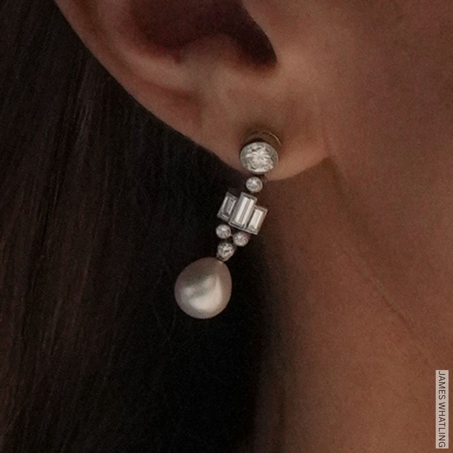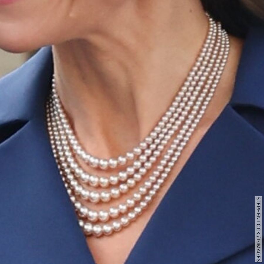 Kate completed her monochromatic ensemble with pearl jewellery, including a vintage necklace and a pair of historic royal earrings. Let’s take a closer look.