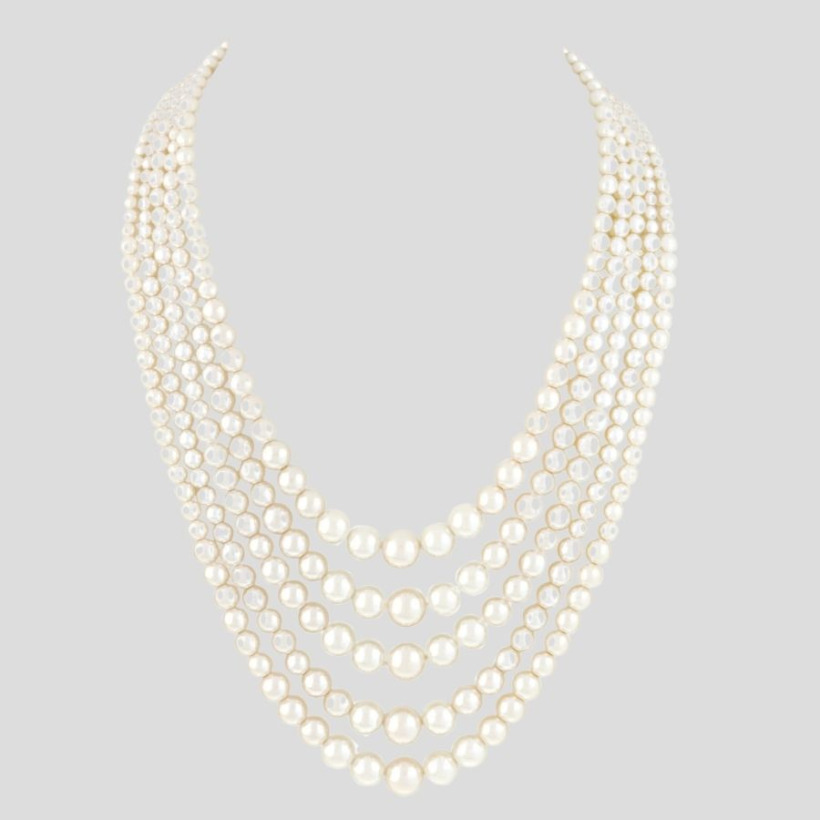 The five-strand faux pearl necklace is from Susan Caplan Jewellery. It’s crafted from vintage pearls that date back to the 1980s.