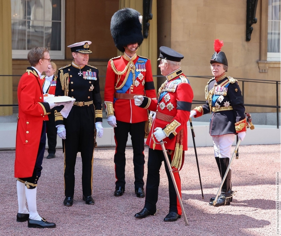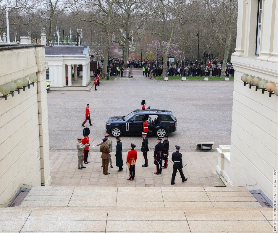 March brings us back to tradition, with the Princess arriving for the Irish Guards’ St Patrick’s Day Parade at Wellington Barracks. This behind-the-scenes image is taken from an elevated viewpoint and captures the moment she is greeted by service personnel in ceremonial uniform.