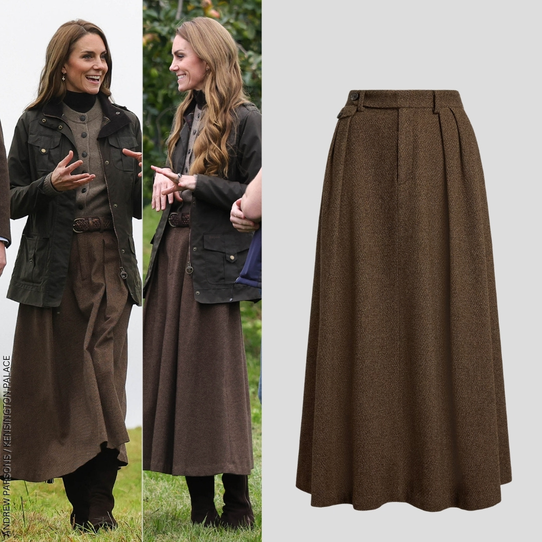 Kate wore the skirt again one month later, in October 2025. During a visit to Northern Ireland, Kate styled the piece in two ways: first beneath a long green coat for official duties with a firefighting training college, and later with a more relaxed country-chic ensemble for a farm visit (she paired it with a wax Barbour jacket, wool cardigan, and brown boots – pictured below).