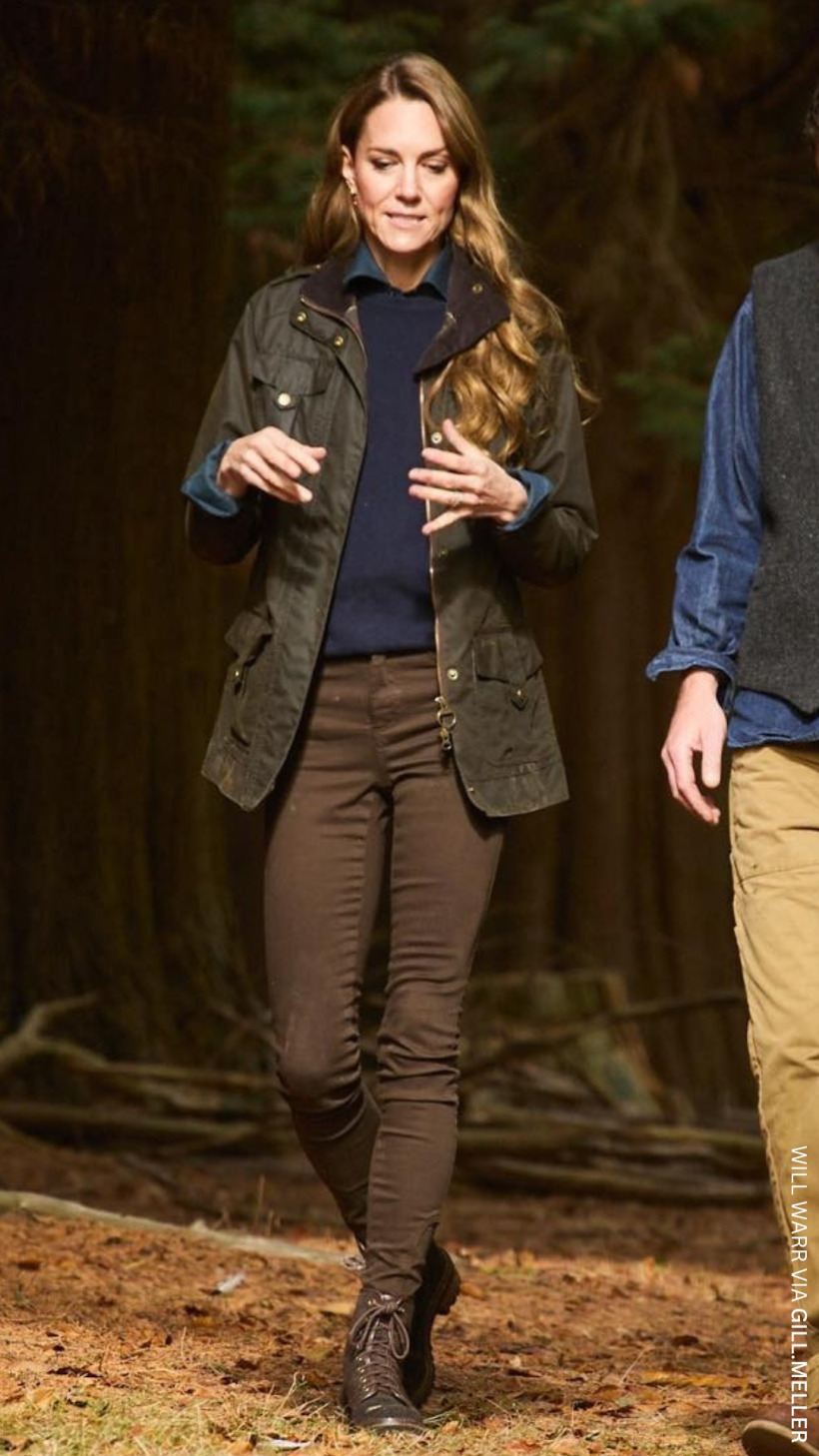 It’s her long-worn Barbour Defence jacket (she owns two; I’d say she’s wearing her longer, dark green version here).