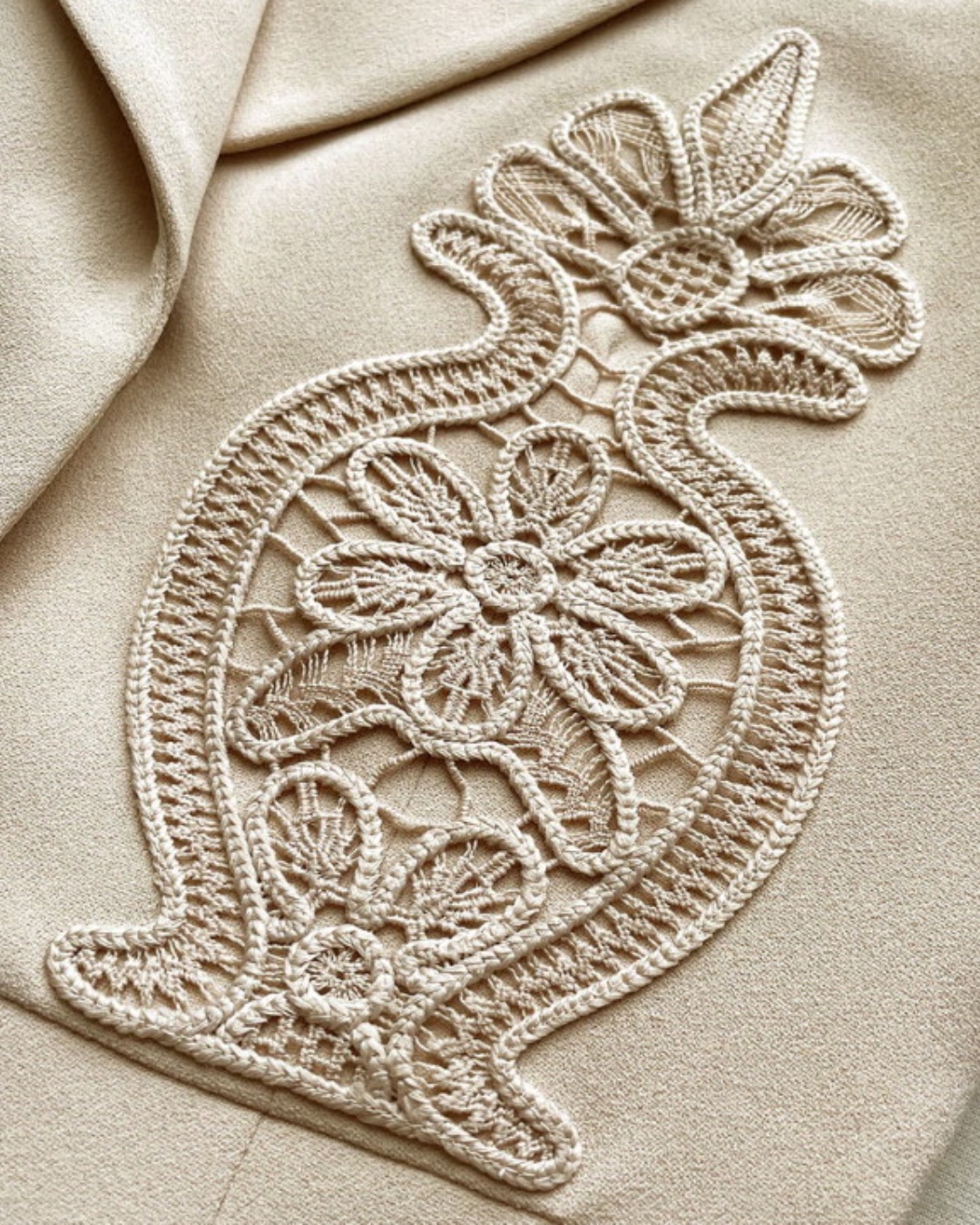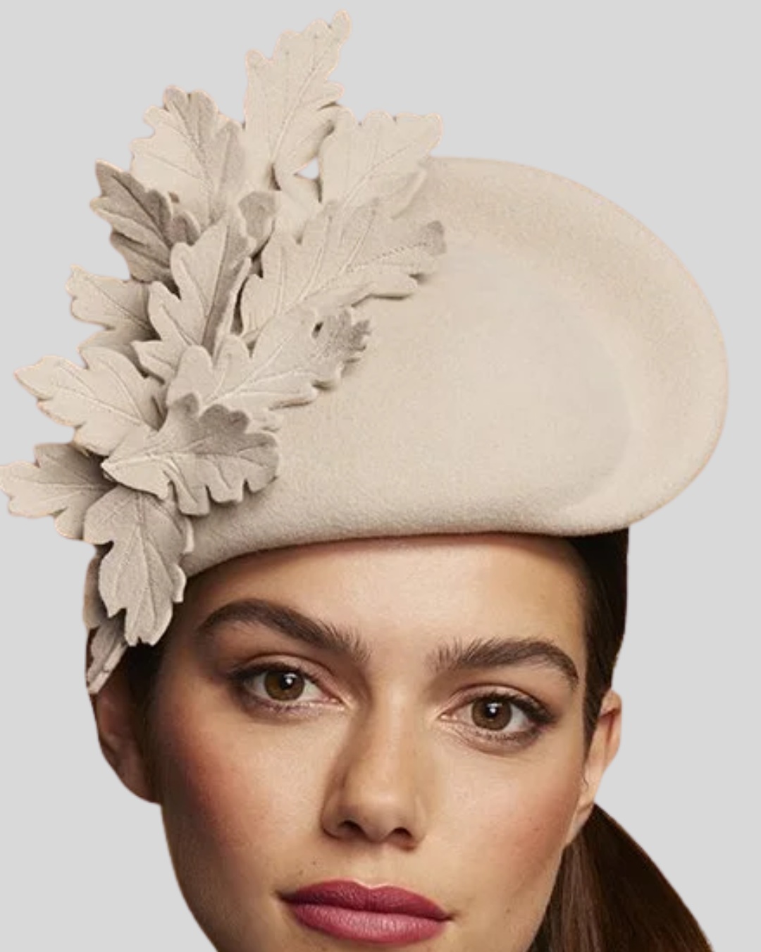 The teardrop-shaped hat features delicate fabric oak leaf appliqués.