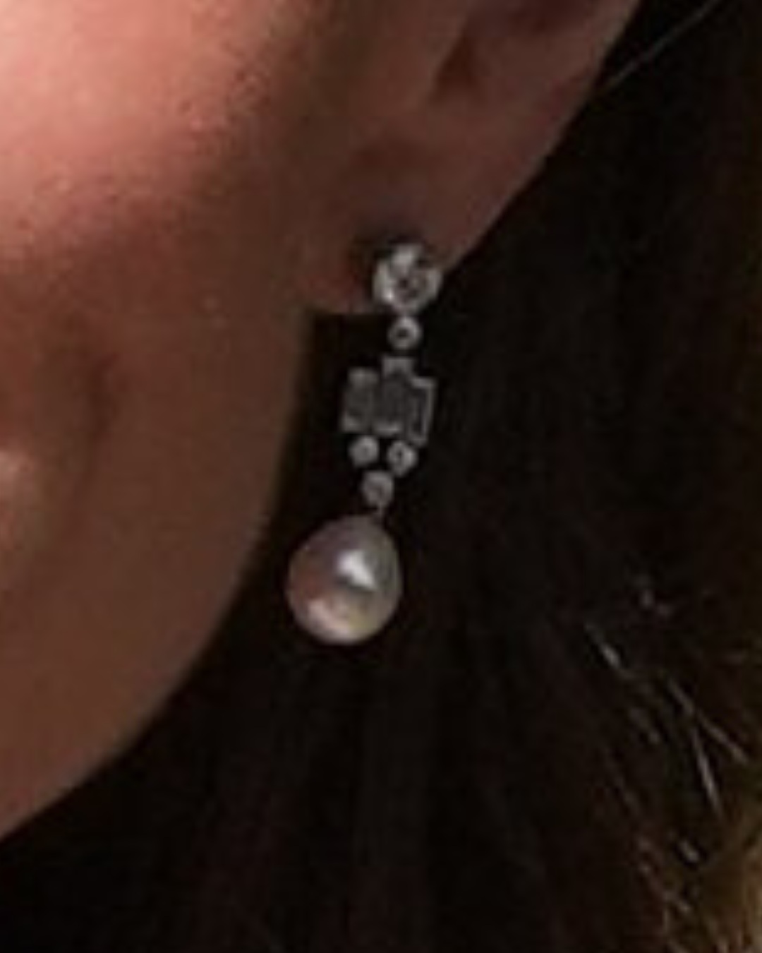 The earrings are part of the Royal Collection. They feature one large round diamond at the top, with a geometric arrangement of baguette and smaller round diamonds underneath. A Bahrain pearl dangles below.