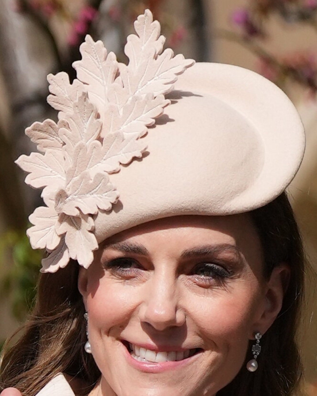 Right, onto Kate’s hat now. The Princess topped her ensemble with a new teardrop-shaped percher hat by Juliette Botterill in a soft cream tone.