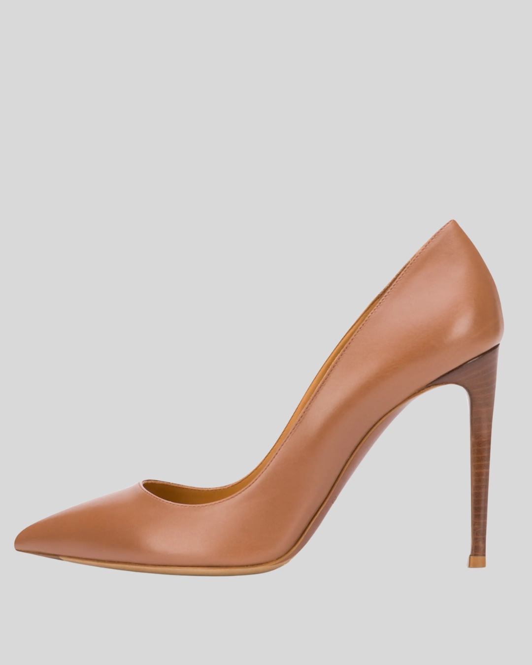 The Italian-made court shoe features a sharp pointed toe, a sculpted topline and a 4″ heel, with a padded branded leather insole.