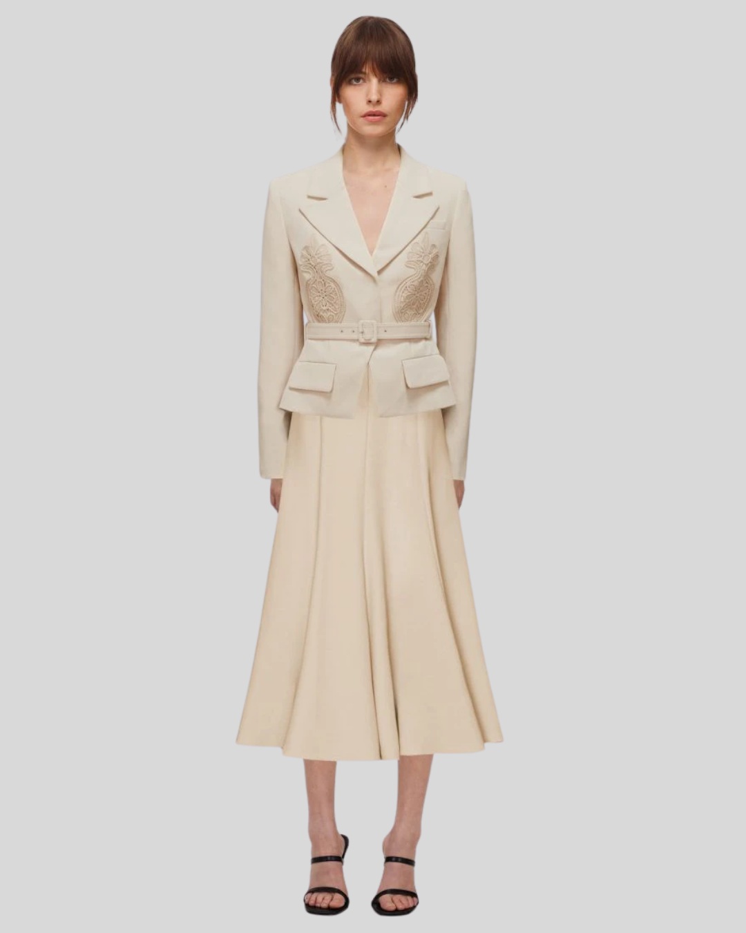 The polished, structured design reads as a jacket and skirt at first glance—but is in fact a single garment.