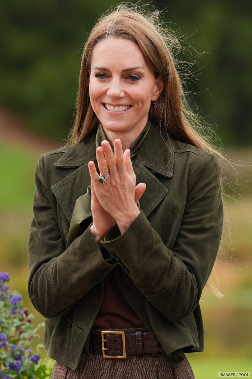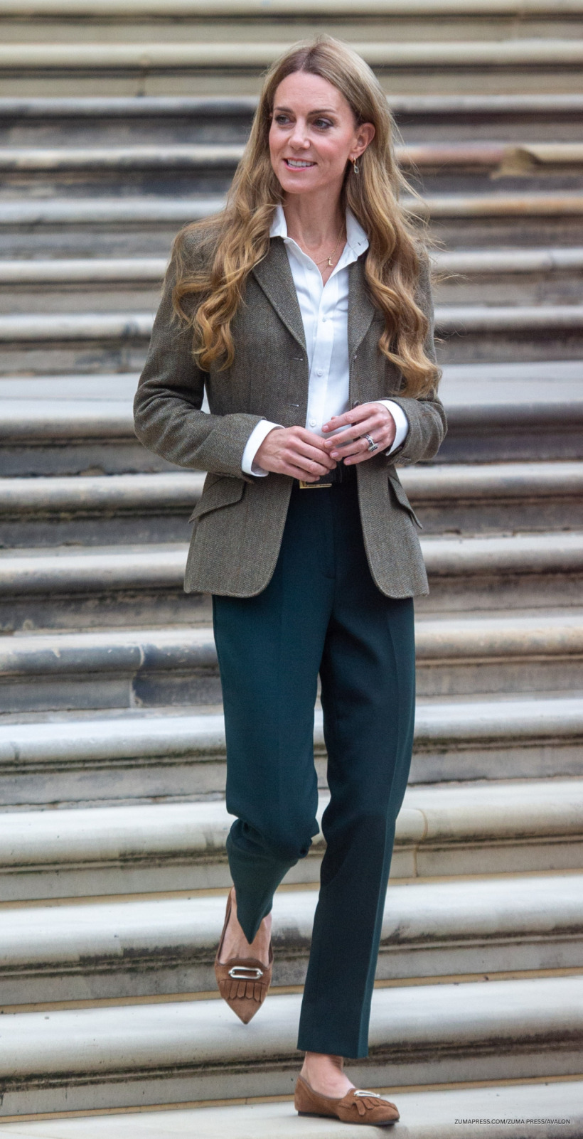 We refer you back to her engagement at the Natural History Museum in London. Remember her herringbone tweed blazer, forest green trousers and tan brown shoes? Gorgeous!