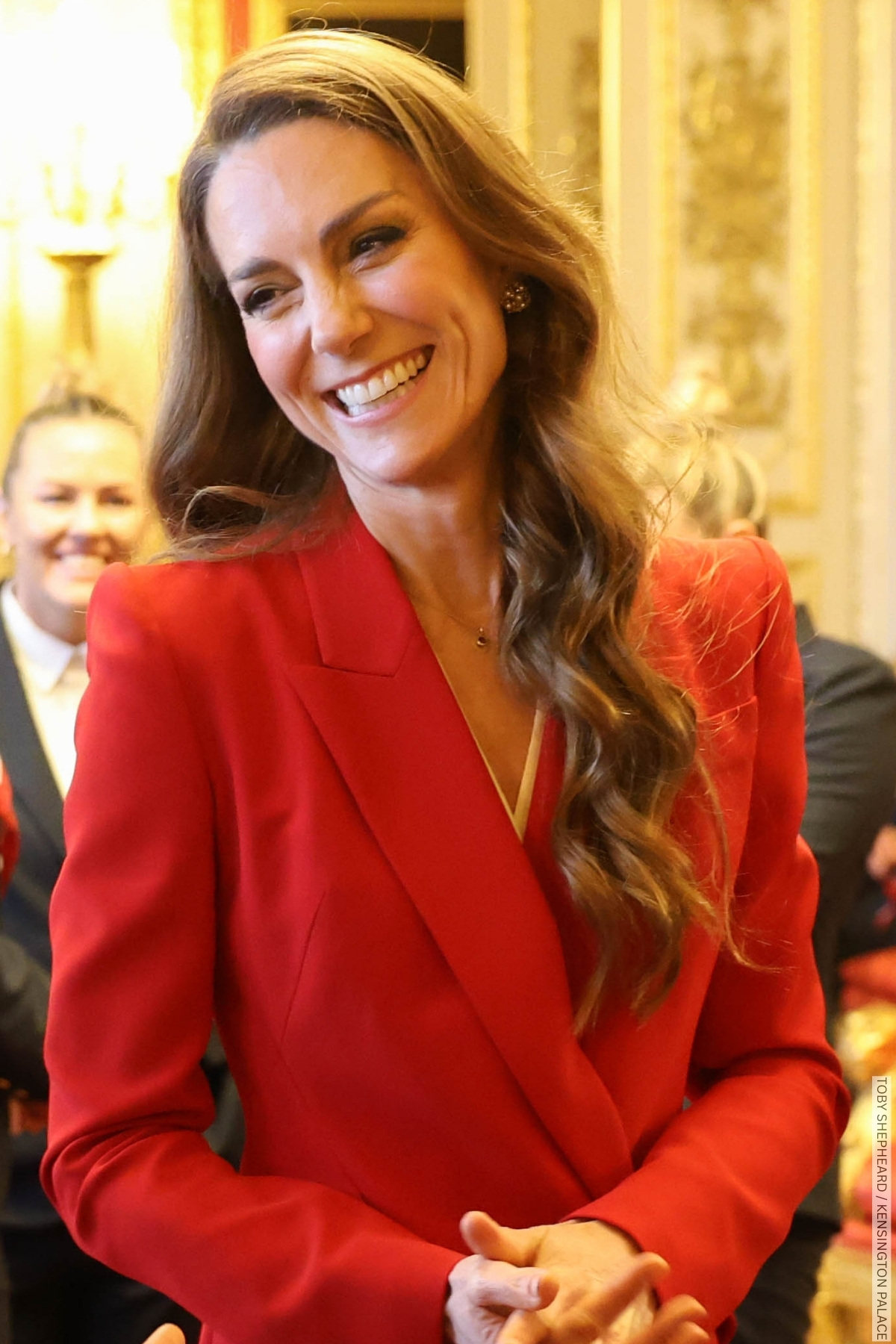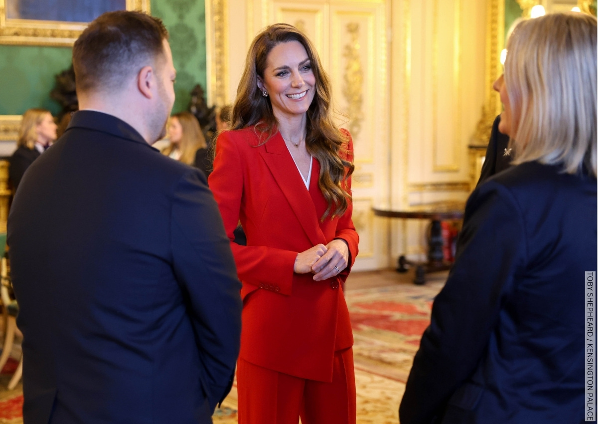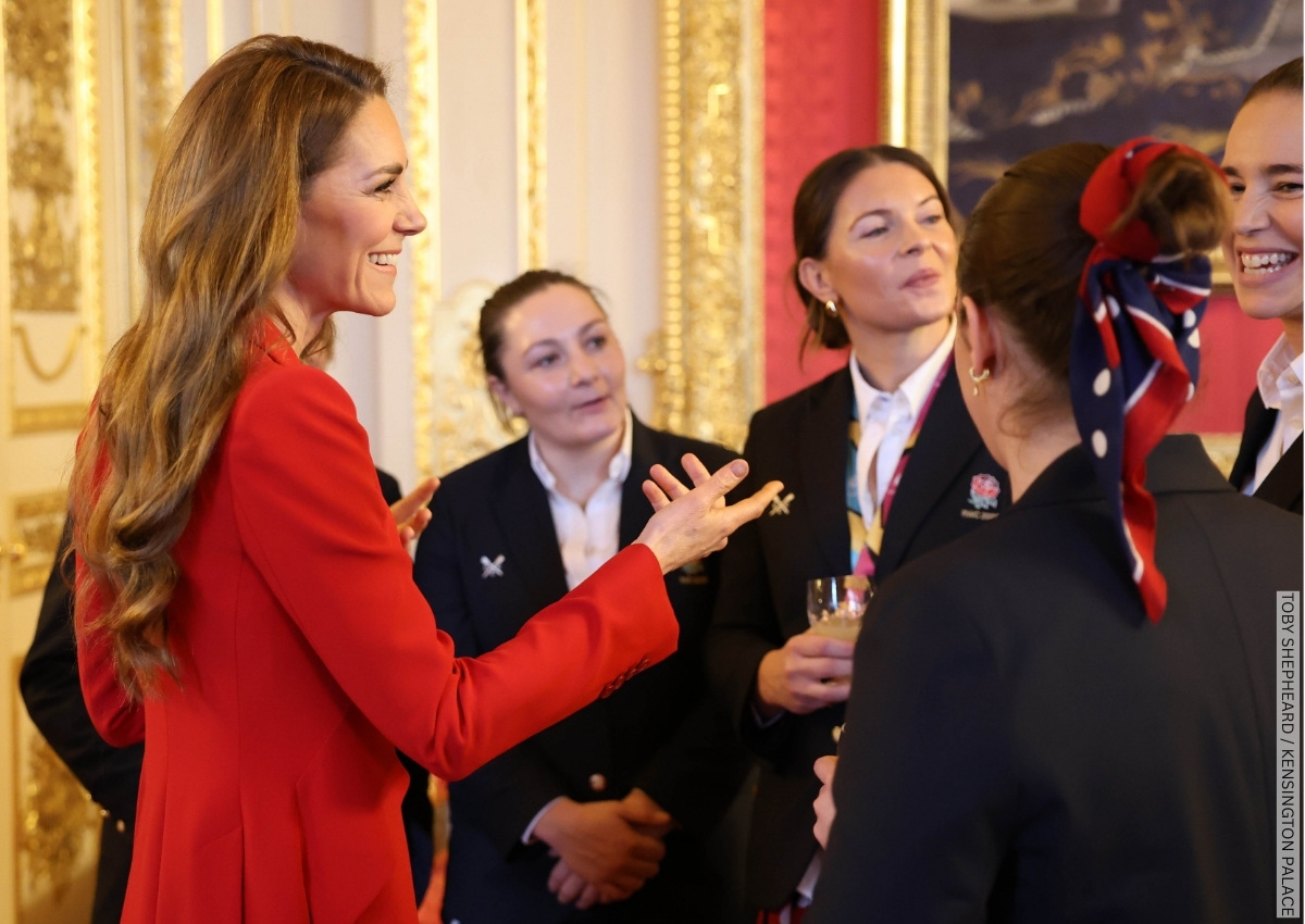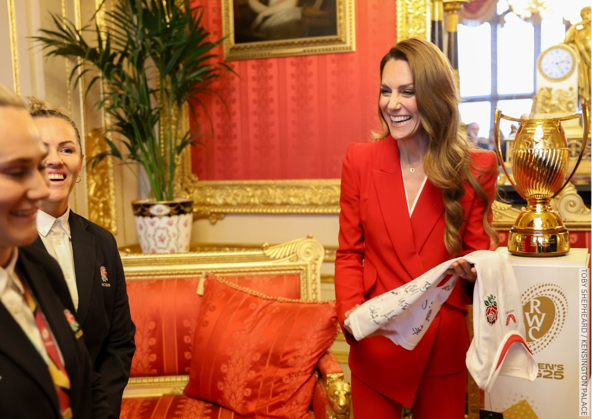 Kate Middleton stepped out in sharp tailoring earlier today as she hosted a reception at Windsor Castle celebrating the England Women’s Rugby team’s World Cup victory last September.